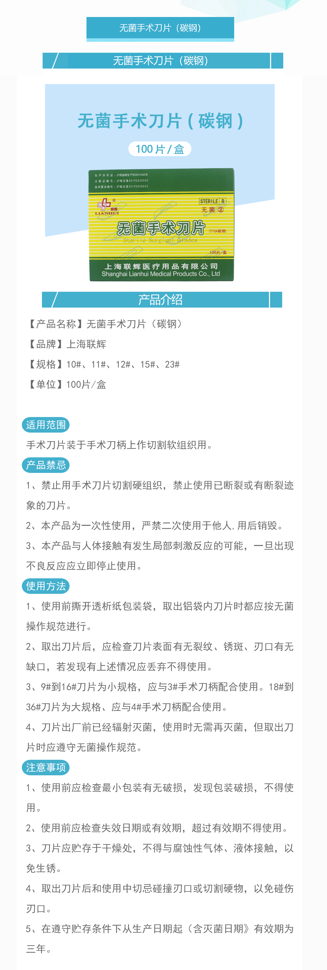 产品名称:无菌手术刀片(碳钢)