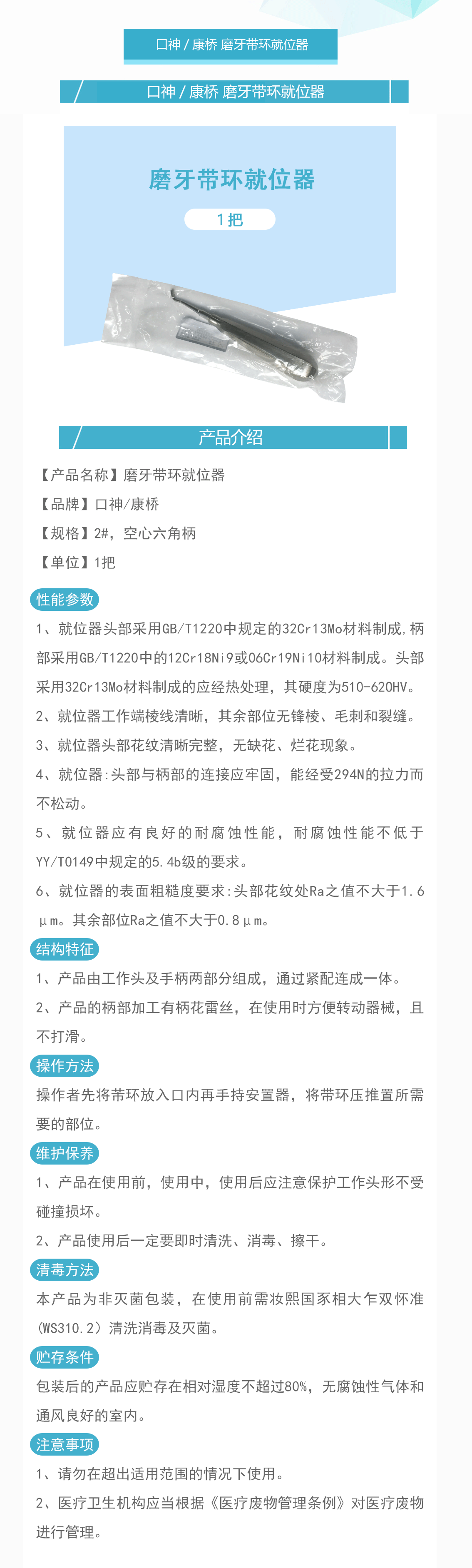 产品名称:正畸带环推置器(磨牙带环就位器) 2#,空心六角柄