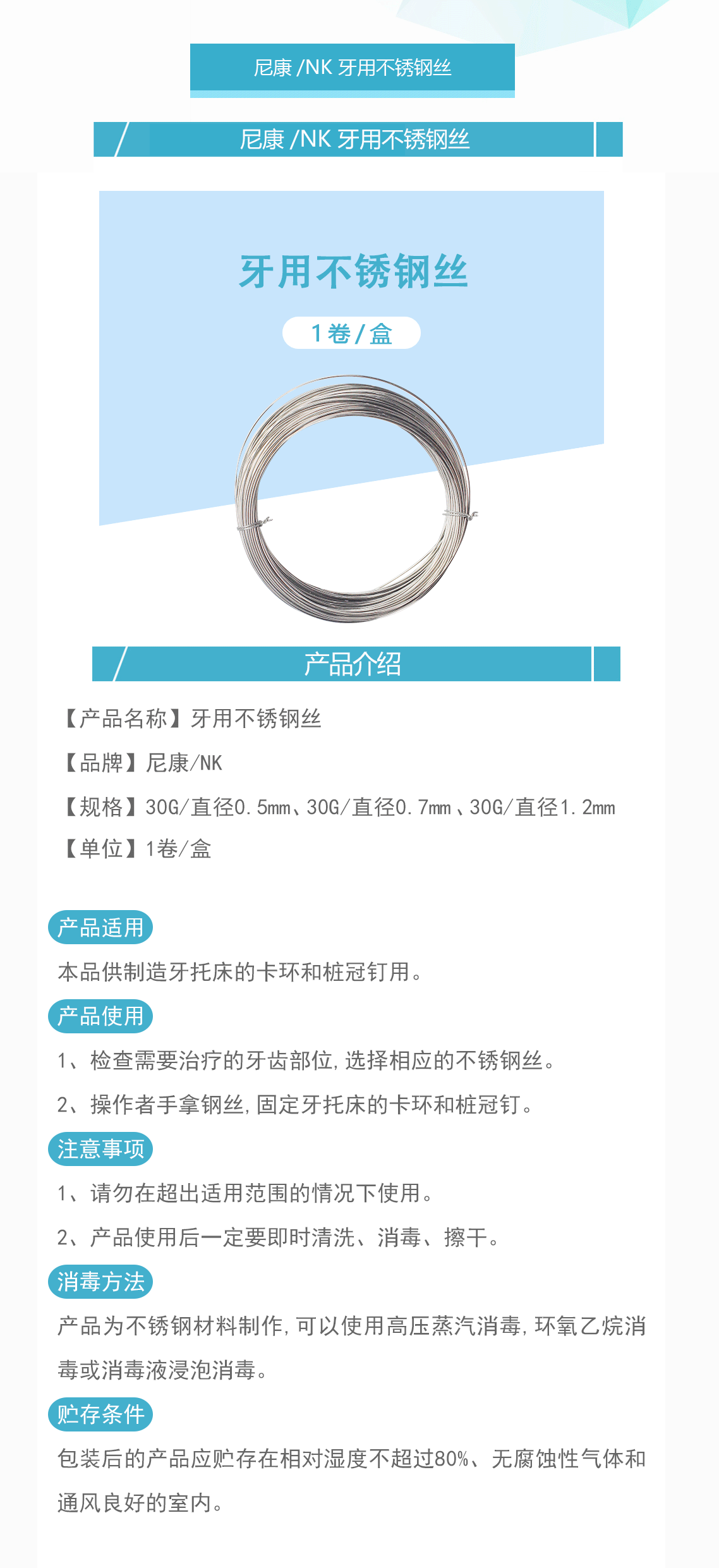 产品名称:牙用不锈钢丝 30G
