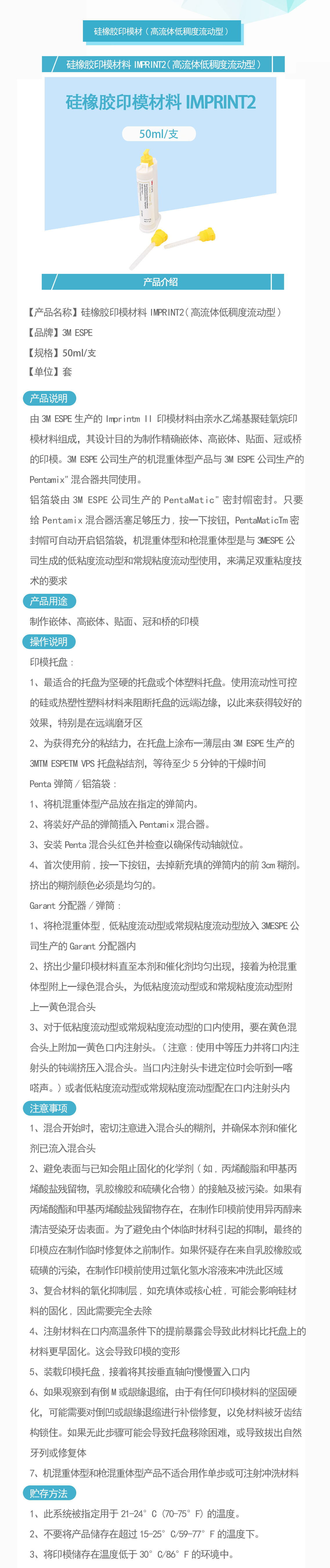 产品名称:硅橡胶印模材料IMPRINT2(高流体低稠度流动型)