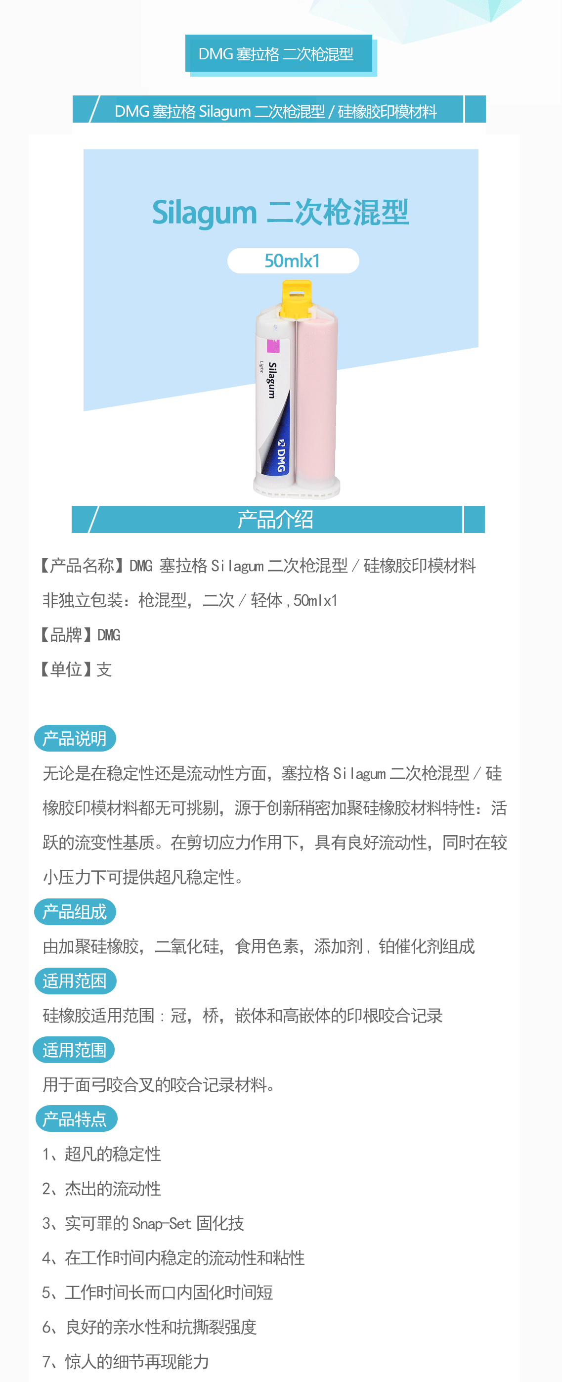 产品名称:塞拉格Silagum二次枪混型/硅橡胶印模材料 非独立包装:枪混型,二次/轻体